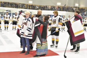 The star blankets gifted at the Opening Ceremonies were creatively designed by Jessica Moore and were presented to each team’s Captain by Bettie Paley, Executive Assistant, SIGA and Wildcats Alumni, Carlin Nordstrom. It is believed that when you are wrapped in a Star Blankets your ancestors are with and among you. The guiding star represents a new beginning, the journey from darkness to the light, from ignorance to the truth. The giver usually chooses the colours that represent the individual to tell their story, show their personality and reflect their accomplishments, in this case the colours were chosen to represent this West Regionals Cup. The blankets are used to honour, protect, and celebrate the individual and in this case the teams.