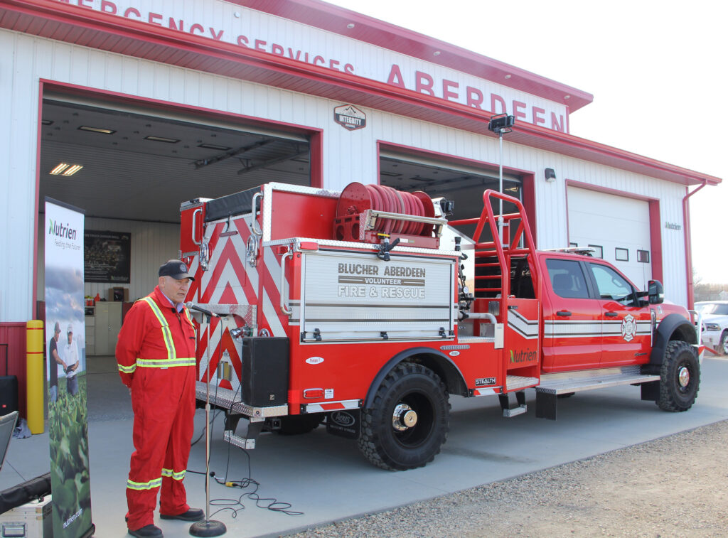 Because of Nutrien’s generosity in helping to buy the truck (and past support for the fire hall, which bears the company’s logo), mine general manager Rob King was invited to perform the official key-turning for the truck.