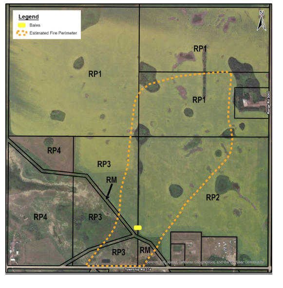 On May 3, 2025, a grass fire spread through three parcels of land at 30-37-6-W3, although there reportedly were subsequent rekindling events on May 4 and May 8. The fire apparently began in a ditch along Township Road 374, which would be RM property.