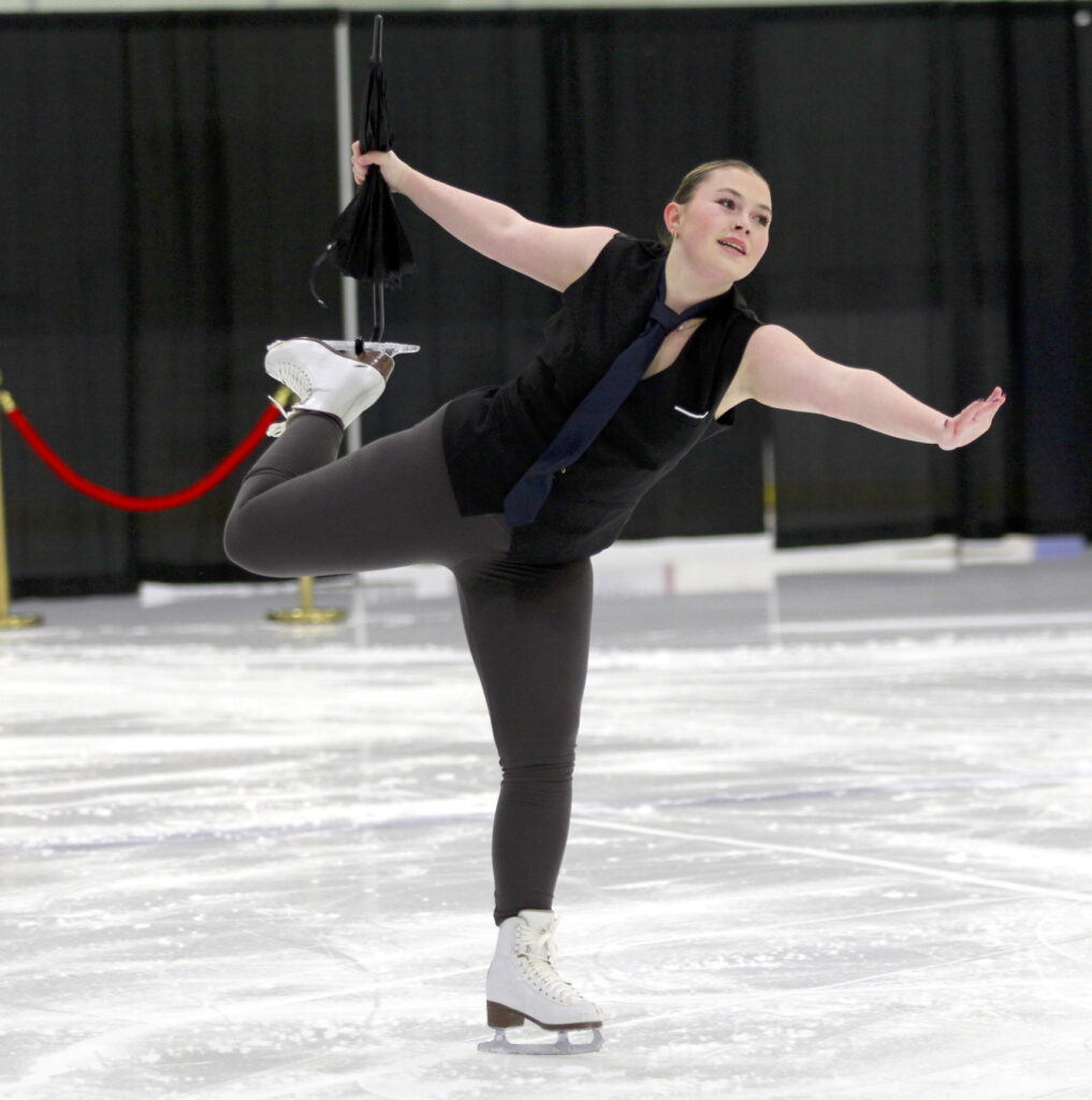 Ashley Ewert skates to the song “Singin’ in the Rain” by Gene Kelly.