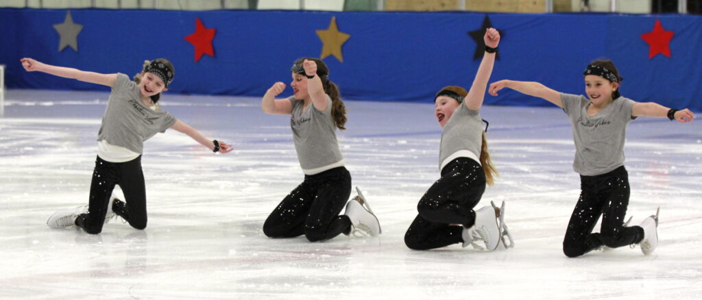 The STAR 1&2 skaters drop to their knees and slide on the ice while performing to the song “I Was Made for Loving You” by KISS.