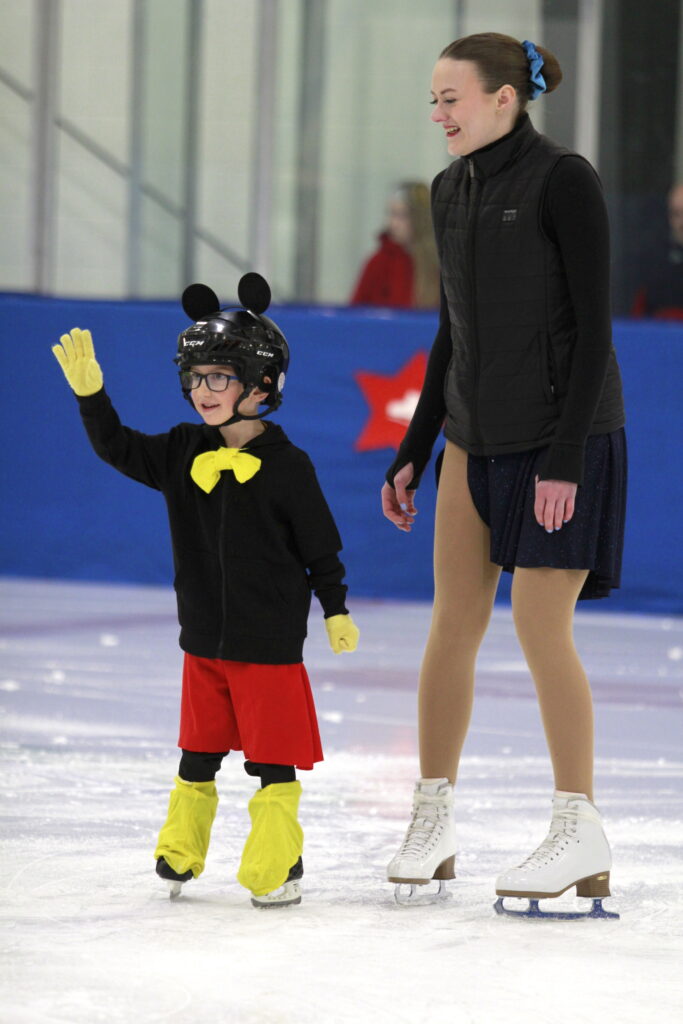 One of the PreCan Butterflies waves to the audience while skating to the Mickey Mouse Clubhouse theme.