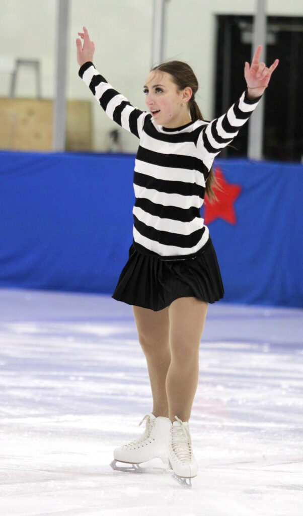 Alexis Bothner, Alynne Michaud and Reteyah Mujer (in no particular order) skate in a line to the song “Dancing Queen ” from the musical Mama Mia. The theme for this year’s carnival was “Hollywood Stars on Ice,” and thus most of the songs the skaters performed to were from movies.