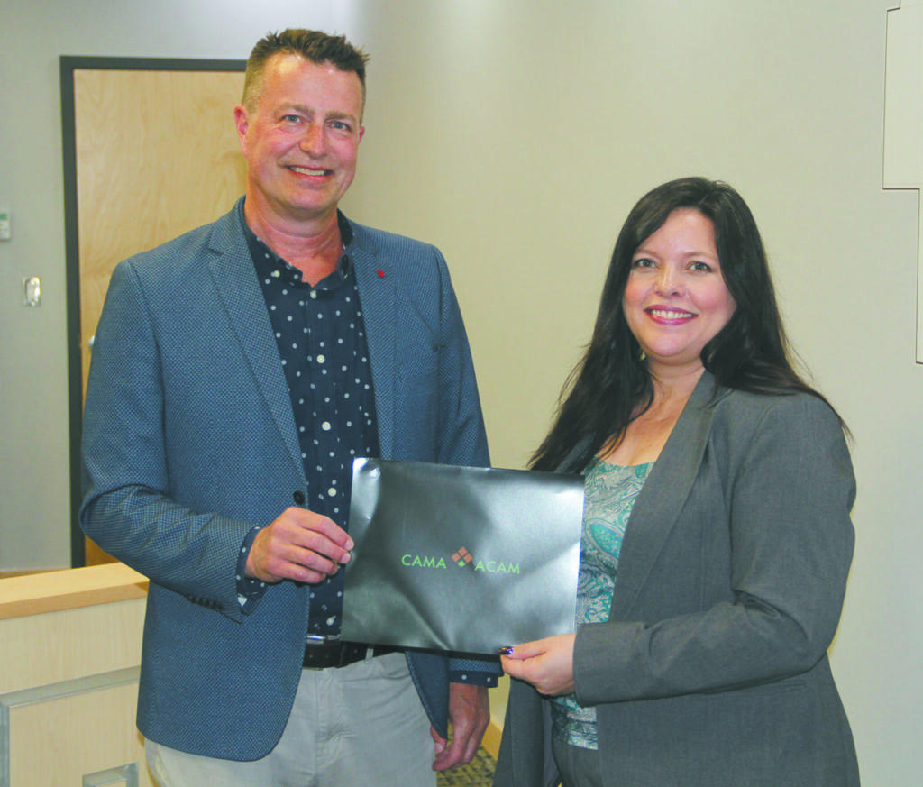 Martensville Mayor Kent Muench presents City Manager Tanya Garost with the 15-year Long Service Recognition Award from the Canadian Association of Municipal Administrators (CAMA).